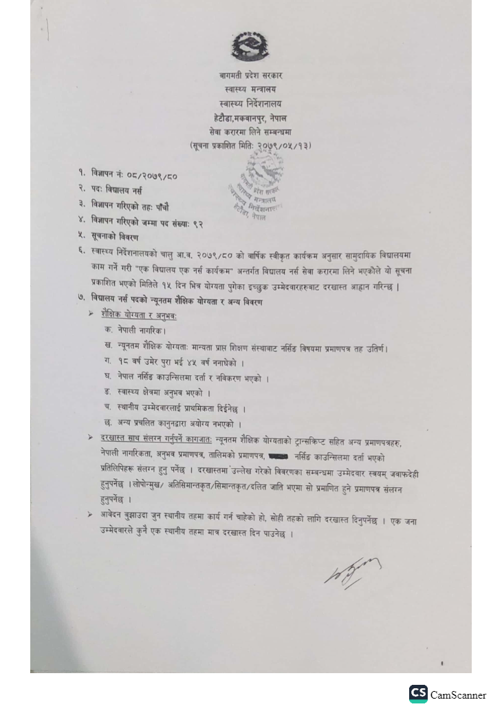 मन्त्रालयको ‘एक बिद्यालय एक नर्स’ कार्यक्रम अन्तरगत कर्मचारी राख्न लागिएको स्वास्थ्य निर्देशनालय हेटौंडाले जनाएको छ । निर्देशनालयले बिभीन्न जिल्लाका स्थानीय तह र बिद्यालयको नाम समेत खुलाएर बिद्यालय नर्स माग गरेको छ ।