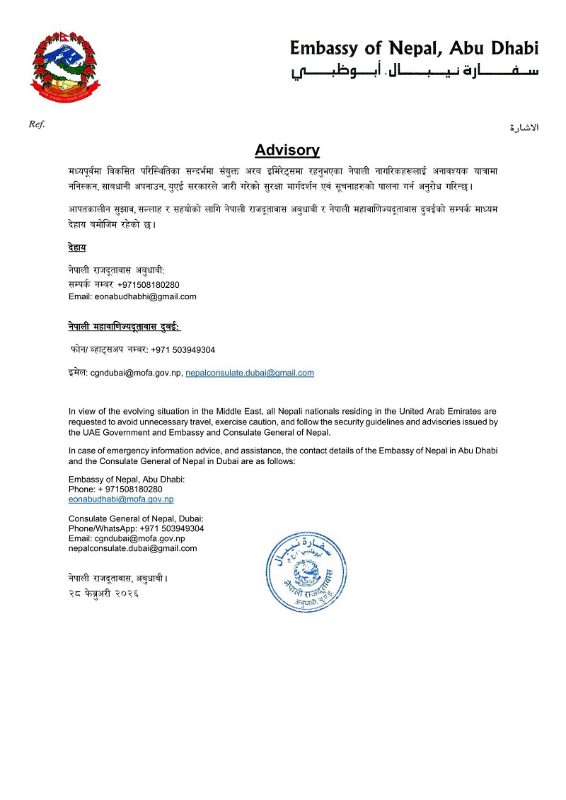 काठमाण्डौ । संयुक्त अरब इमिरेट्स (यूएई)मा रहेको नेपाली दूतावासले यूएईमा रहेका नेपाली नागरिकहरूलाई अनावश्यक यात्रा नगर्न आग्रह गरेको छ । दूतावासले विज्ञप्ति निकालेर मध्यपूर्व क्षेत्रमा विकसित भइरहेका परिस्थितिका कारण नेपाली नागरिकलाई अनावश्यक यात्रा नगर्न र उच्च सतर्कता अपनाउन आग्रह बताएको छ ।