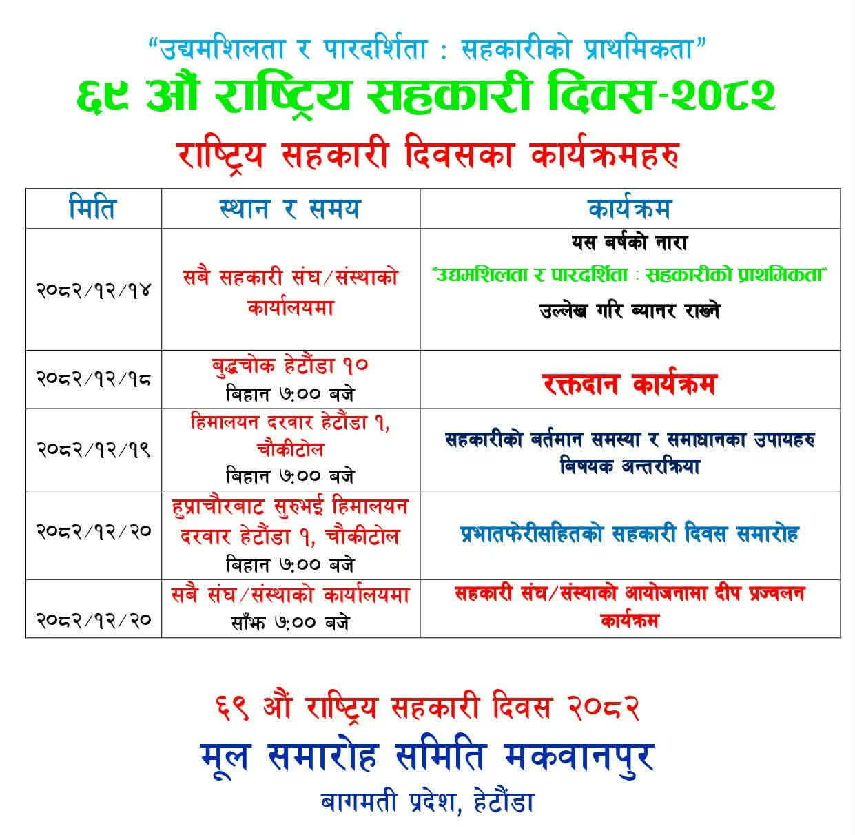 ६९ औं राष्ट्रिय सहकारी दिवस-२०८२ मूल समारोह समित संयोजक नारायण प्रसाद देबकोटाको अध्यक्षता तथा बागमती प्रदेश सहकारी तथा गरिबीनिवारण मन्त्रालय हेटौंडाका महाशाखा प्रमुख उमेश कुमार दाहालको प्रमुख आतिथ्यतामा कार्यक्रम भएको थियो ।